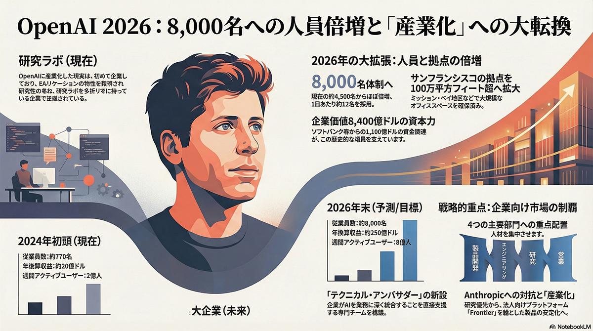 テクノロジー業界全体では人員削減の動きも見られる中、OpenAIは高成長を維持するための積極的な投資と採用を継続し、製品の迅速な開発と市場への投入を推し進める体制を構築している。