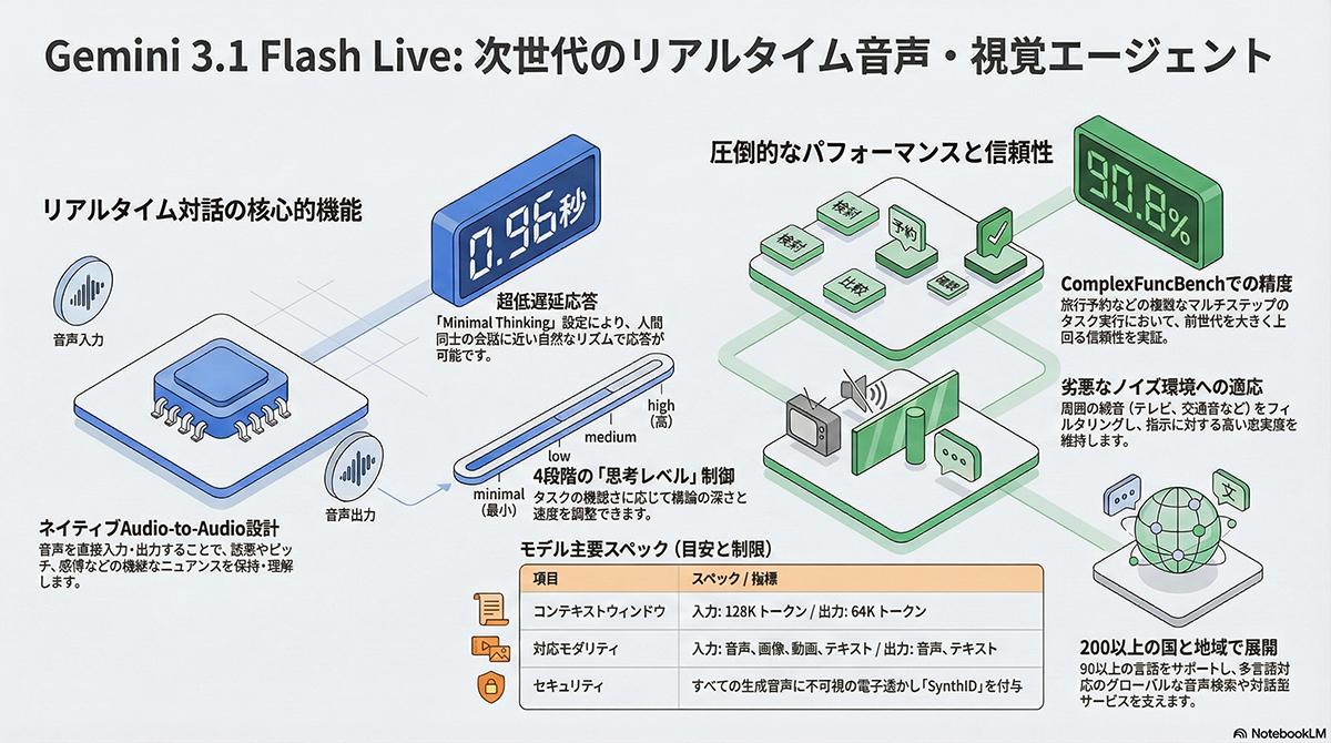 また、複数の制約条件を伴う関数呼び出しを評価する「ComplexFuncBench Audio」でも90.8%のスコアを達成している 。同モデルは、一般ユーザー向けに日本を含む200以上の国と地域に拡大された「Search Live」や「Gemini Live」を通じて利用可能となっている 。開発者向けには「Google AI Studio」を通じて「Gemini Live API」のプレビュー版として提供され、企業向けには「Gemini Enterprise for Customer Experience」に組み込まれている。
