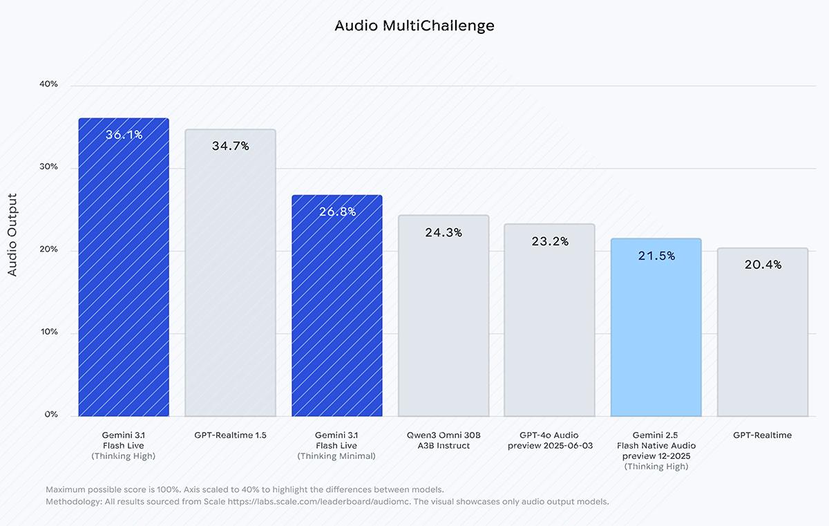 外部の評価機関によるベンチマークテストにおいても高い性能を示しており、米Scale AIが実施した音声モデルの会話能力評価「Audio MultiChallenge」において、「thinking」機能をオンにした状態で36.1%というスコアを記録した。このテストは複雑な指示への対応や、現実世界の音声に特有の途切れやためらいを含む状況下での長期的な文脈維持能力を評価するものである。