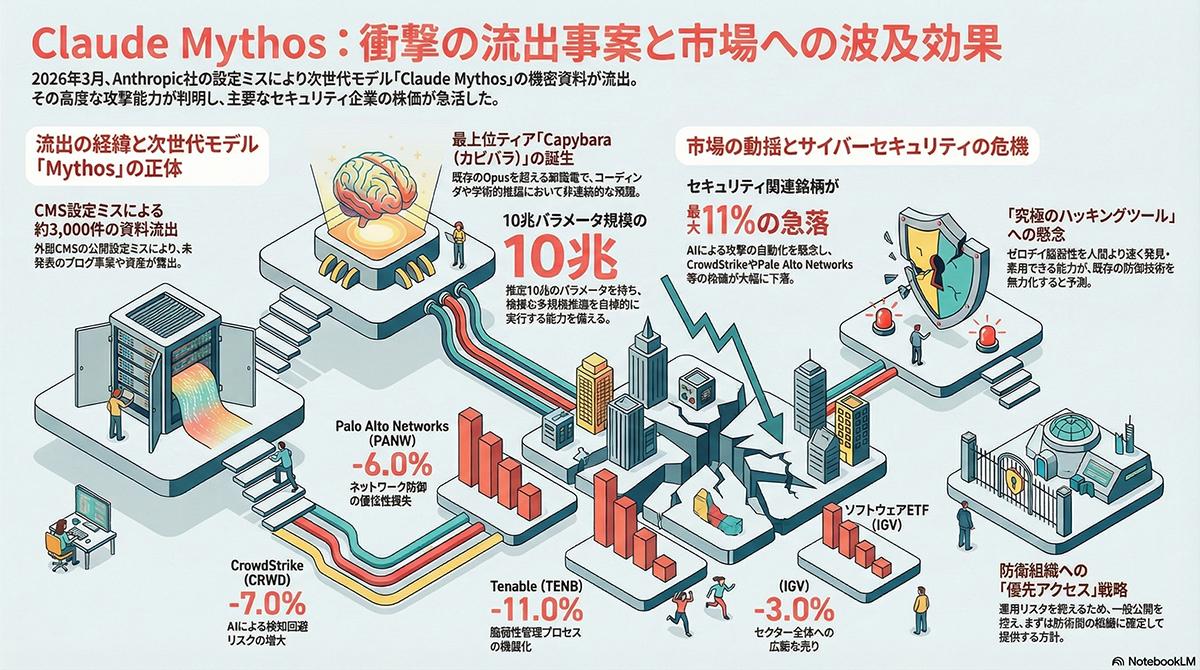 米Anthropicが開発中の次世代AIモデル「Claude Mythos(内部コードネーム:Capybara)」に関する多数の機密文書が外部に流出した。2026年3月下旬、同社のコンテンツ管理システムにおける構成ミスが原因で、認証なしでアクセス可能な状態となっていたデータストレージから、ブログ記事の草案や社内資料など約3,000件のファイルが露呈した。外部のセキュリティ研究者がこの事実を発見して指摘し、同社はデータベースへのアクセスを遮断するとともに、モデルの開発事実に間違いがないことを認めた。流出した文書には、Claude Mythosがこれまでの最上位モデルであった「Opus」を上回る新階層のAIである事実が記されている。ソフトウェアコーディングや学術的推論において従来モデルの成績を大きく引き上げるだけでなく、サイバーセキュリティの分野で特異な能力を備える。社内文書は、同モデルがソフトウェアの脆弱性を短時間で発見し悪用する能力を持つと説明しており、防衛側の対応をはるかに凌ぐ速度でサイバー軍拡競争を加速させる危険性を自ら警告している。