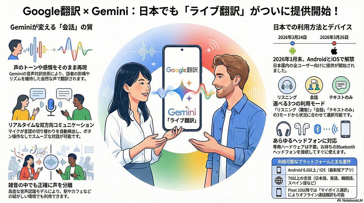 ライブ翻訳は、スマートフォン本体に有線またはBluetoothで接続したヘッドホンを用いて、対面する相手との会話をリアルタイムで翻訳する機能だ。最大の特徴は、Geminiの音声生成AIモデルを利用し、元の話者の声のトーン、抑揚、話すリズムを維持したまま翻訳音声を生成する点にある。従来の機械的な合成音声から脱却し、本人の肉声に近い自然な音声を出力する。基盤となる技術には「Gemini 2.5 Flash Native Audio」などのモデルを採用した。対応言語は70言語以上に及び、翻訳音声の出力先はヘッドホンだけでなく、スマートフォン内蔵スピーカーや外部スピーカーへ変更することもできる。