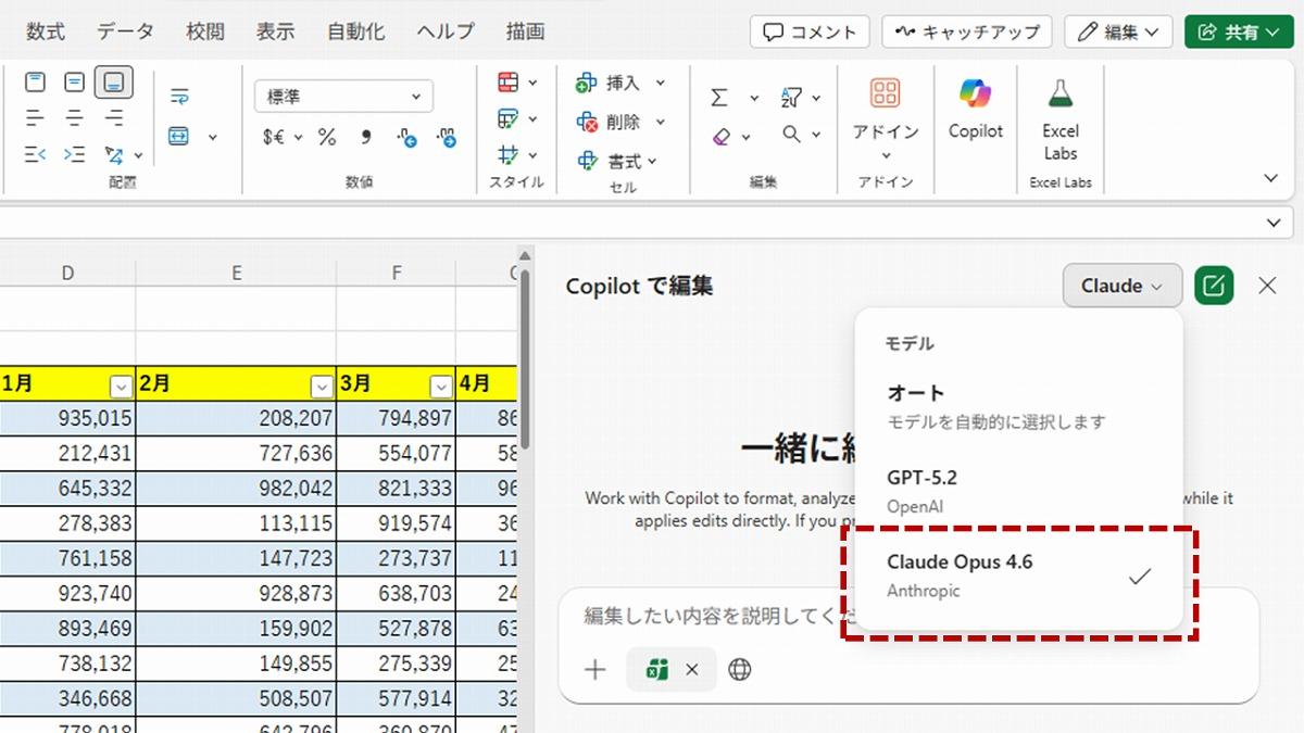エージェントモードはExcelとWordではすでに一般提供が始まっており、今後はPowerPointに加えてOutlookまでと、これから順次展開される予定です。さらにExcelのエージェントモードでは、アンソロピックの最新AIモデルであるClaude Opus 4.6も選択可能になっている点にも注目です。