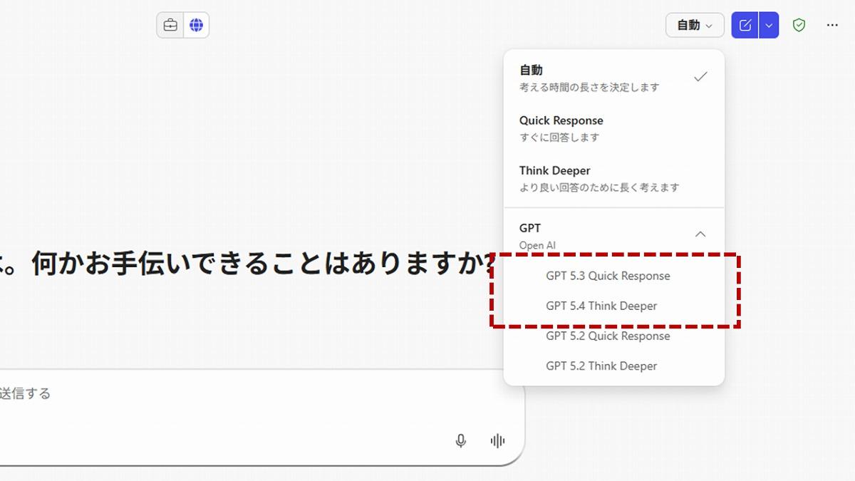 さらに続いて3月6日に「GPT-5.4 Thinking」の展開が開始された際には、こちらもCopilotチャットで「GPT-5.4 Think deeper」という名称で追加されています。このAIモデルは複雑な推論やエージェントワークフローを得意とするモデルで、より難度の高いタスクに対応できます。