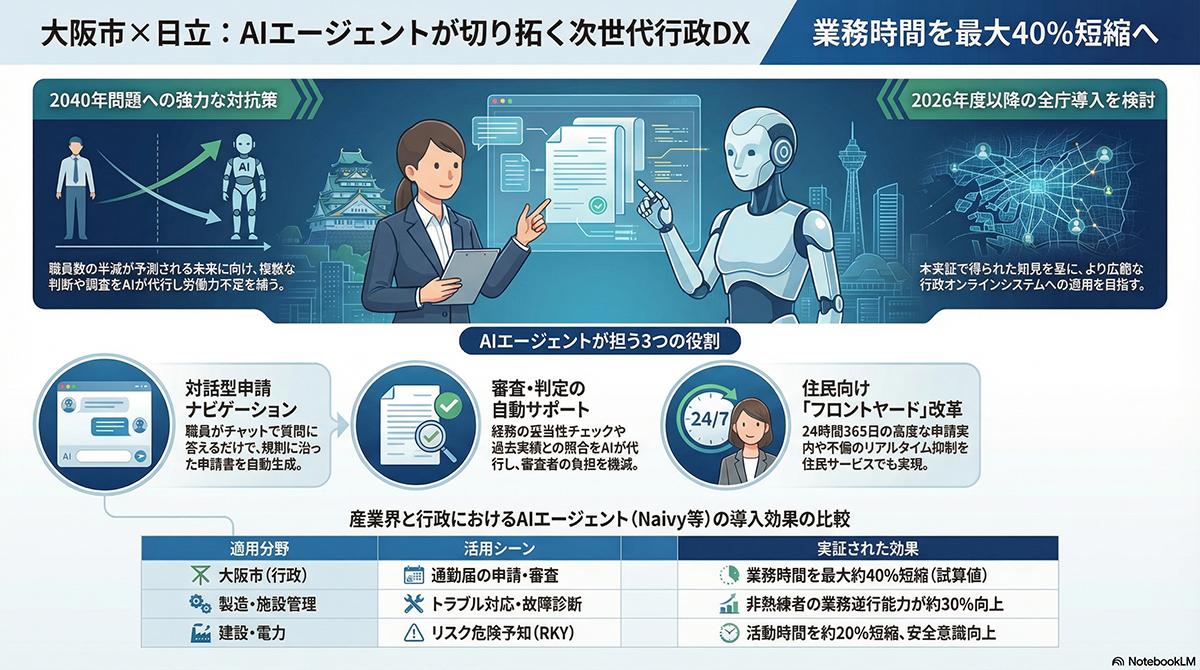 大阪市は現在、「大阪市DX戦略アクションプラン」に沿って全庁的な生成AI環境の整備を進めており、日立製作所が持つ自治体システム構築のノウハウとAIエージェントの活用スキルを融合させた形となる。実証実験は2025年9月から2026年3月にかけて行われる。