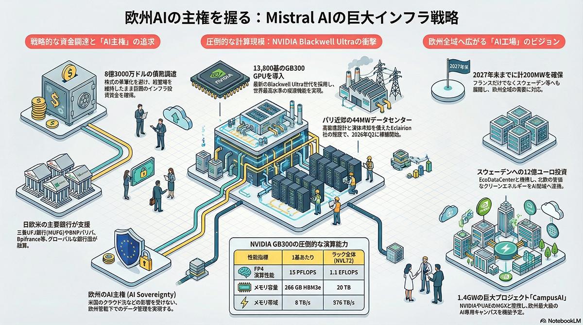 調達した資金はパリ南部のエソンヌ県ブリュイエール・ル・シャテルに展開する専用データセンターへの設備投資に充てられる。フランスのデータセンター事業者であるエクレリオンが運営する同施設に、NVIDIAの次世代AI基盤であるGB300を1万3800基導入する。高密度ラックを活用して初動段階で総容量44メガワットの計算インフラを構築し、2026年6月末までに稼働を開始する。