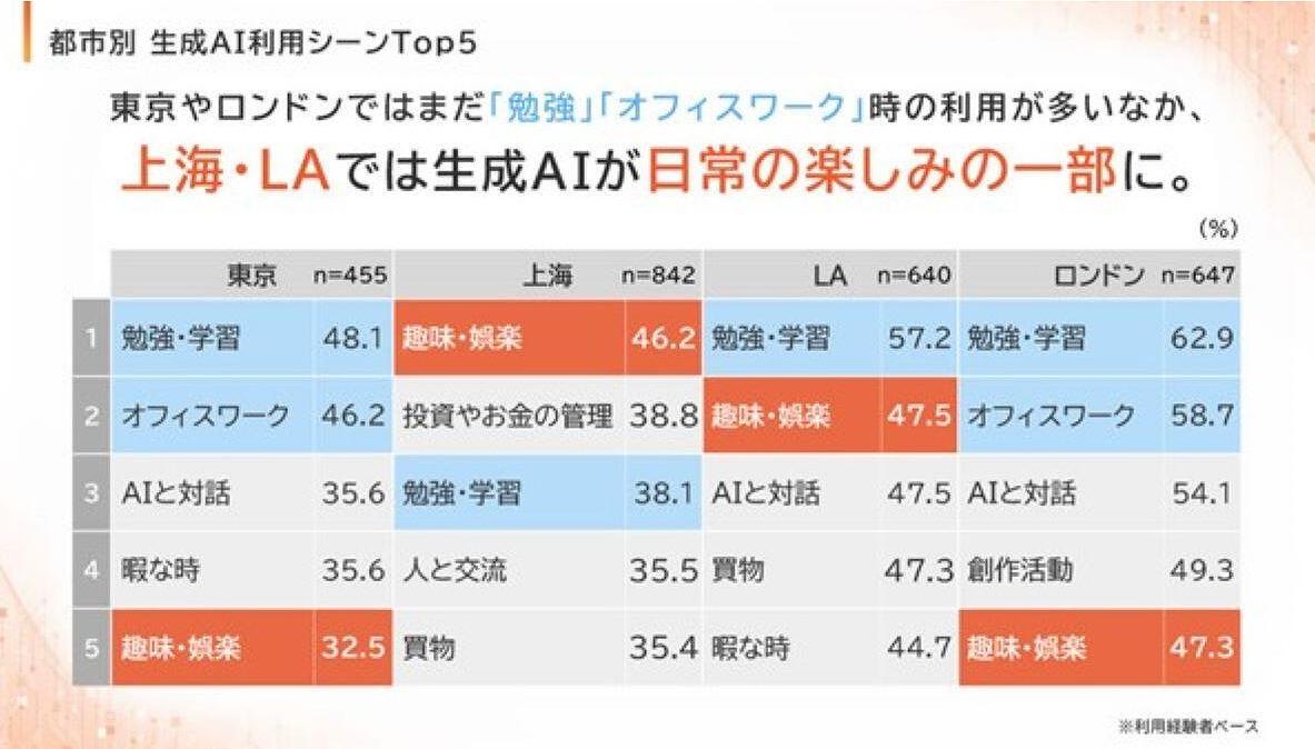 さらに、東京では、生成AIの利用シーンとして「勉強・学習」「オフィスワーク」が上位を占めているが、上海では「趣味・娯楽」「投資やお金の管理」「買い物」が、ロサンゼルスでは「趣味・娯楽」「AIと対話」「買い物」といった項目も上位に上がってきている。つまり、上海・ロサンゼルスでは、プライベートでの生成AI利用が進んでいるということだ。