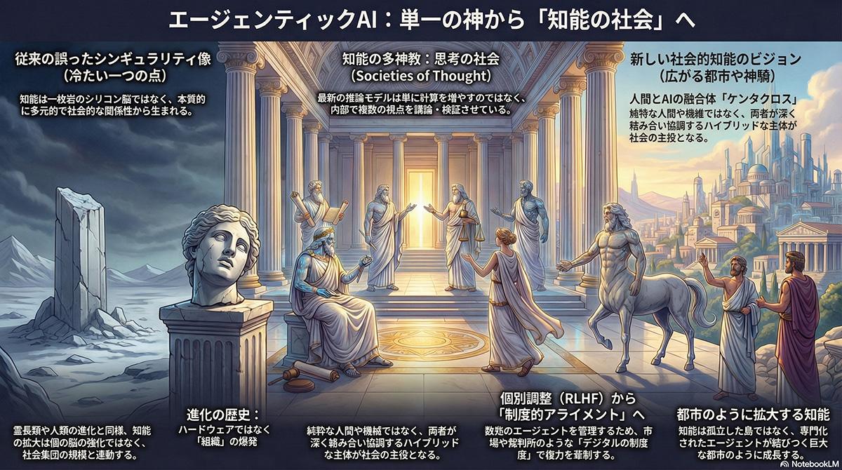 現在の大規模言語モデルも、人類が何千年にもわたって蓄積した社会的認知のデータを出力として学習しており、外部化された人類の社会的知能をデジタルの基盤上で再構築しているにすぎない。研究チームは、次なる知能の爆発とは未知の巨大な単一脳が目覚めるイベントではなく、専門化したAIと人間が都市のように複雑に絡み合い、互いに協力し合う社会的な進化の過程であると結論づけている。