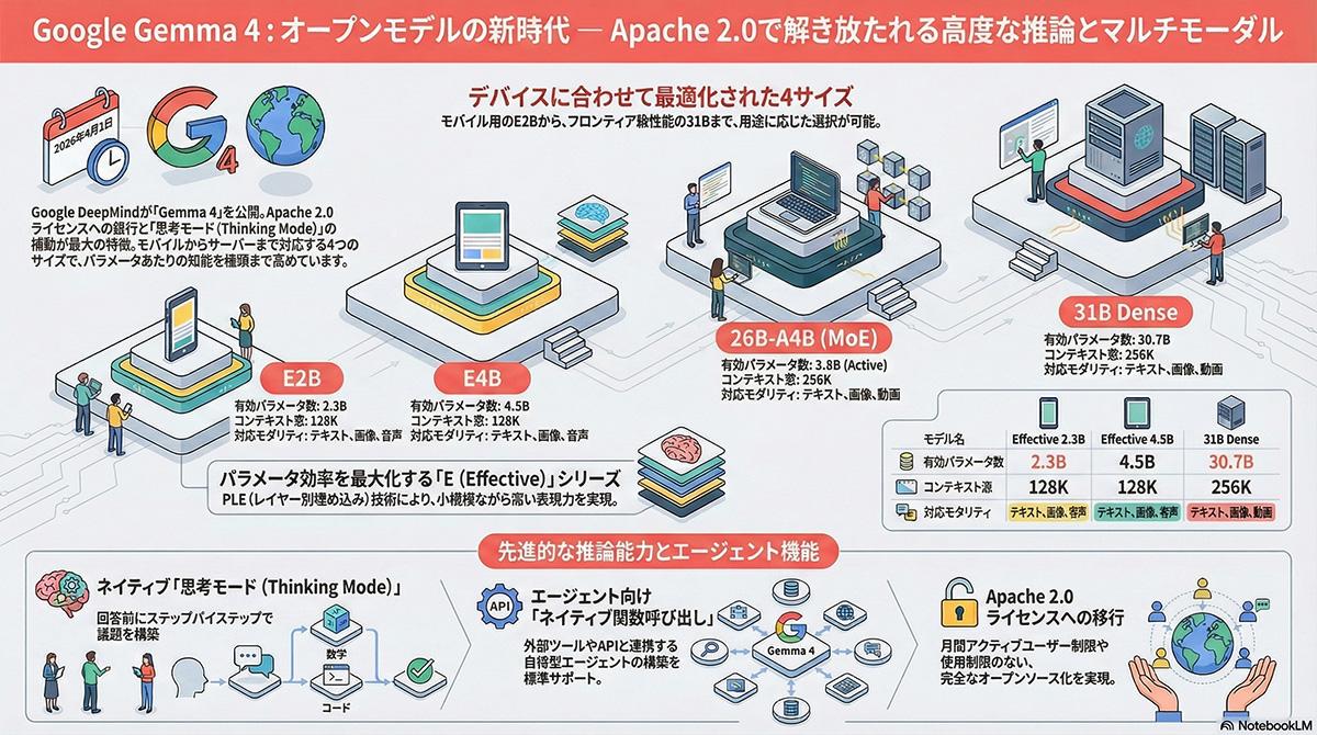 提供されるモデルは、モバイル端末やIoTデバイスでのエッジ推論に向けてメモリ効率を最大化した「E2B(Effective 2B)」および「E4B」、小規模なワークステーションやPC上で高速な推論を実現する「26B MoE(Mixture of Experts)」、ファインチューニングの基盤となる「31B Dense」の4種類である。26B MoEモデルは推論時に約40億パラメータのみをアクティブにするスパースアーキテクチャを採用しており、小規模モデルと同等の推論コストで大規模モデルの品質を実現する。全モデル共通で256Kトークンのコンテキストウィンドウを備え、140以上の言語に対応している。