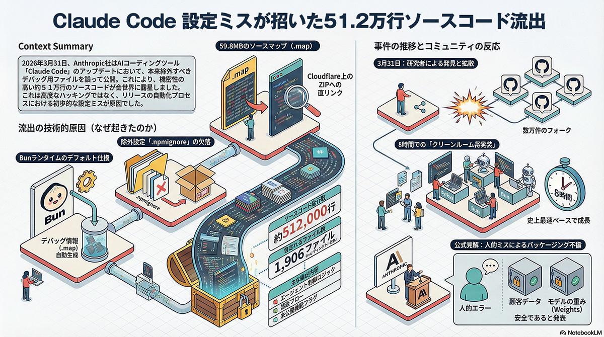 原因としては、Claude Codeのビルドに使用されているBunランタイムがデフォルトでソースマップを生成する仕様であったことと、公開設定において.mapファイルを除外する指定が欠落していたことが挙げられている。なお、同社によるソースマップの混入事故は2025年にも発生しており、今回が二度目の事態となった。