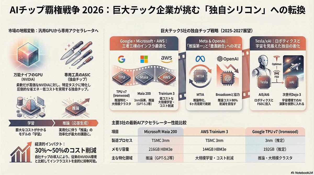 こうしたAnthropicの動きに代表されるように、AI半導体市場では、ハイパースケーラーによる独自チップ開発競争が加速している。グーグル、マイクロソフト、アマゾン、メタ、オープンAI、テスラ(xAI)といった巨大テック企業は、高騰する汎用GPUの調達コスト削減と自社モデルへの最適化を目指し、垂直統合型のインフラ戦略を強化している。グーグルは、実績のある独自AI半導体「TPU」の第7世代「Ironwood」を投入し、アンスロピックとの210億ドル規模とされる提携を通じて大規模な計算資源を確保した。マイクロソフトは推論特化型チップ「Maia 200」を公開し、自社クラウドとの統合により高い費用対効果を追求している。アマゾンは「Trainium」や「Inferentia」の次世代機開発を継続し、メタも「MTIA」シリーズを6カ月間隔で更新する強気なロードマップを掲げ、推論ワークロードの自社化を急いでいる。また、オープンAIは「Titan」の開発に着手し、テスラは「Dojo」プロジェクトを通じて自動運転モデルの学習効率向上を狙う。