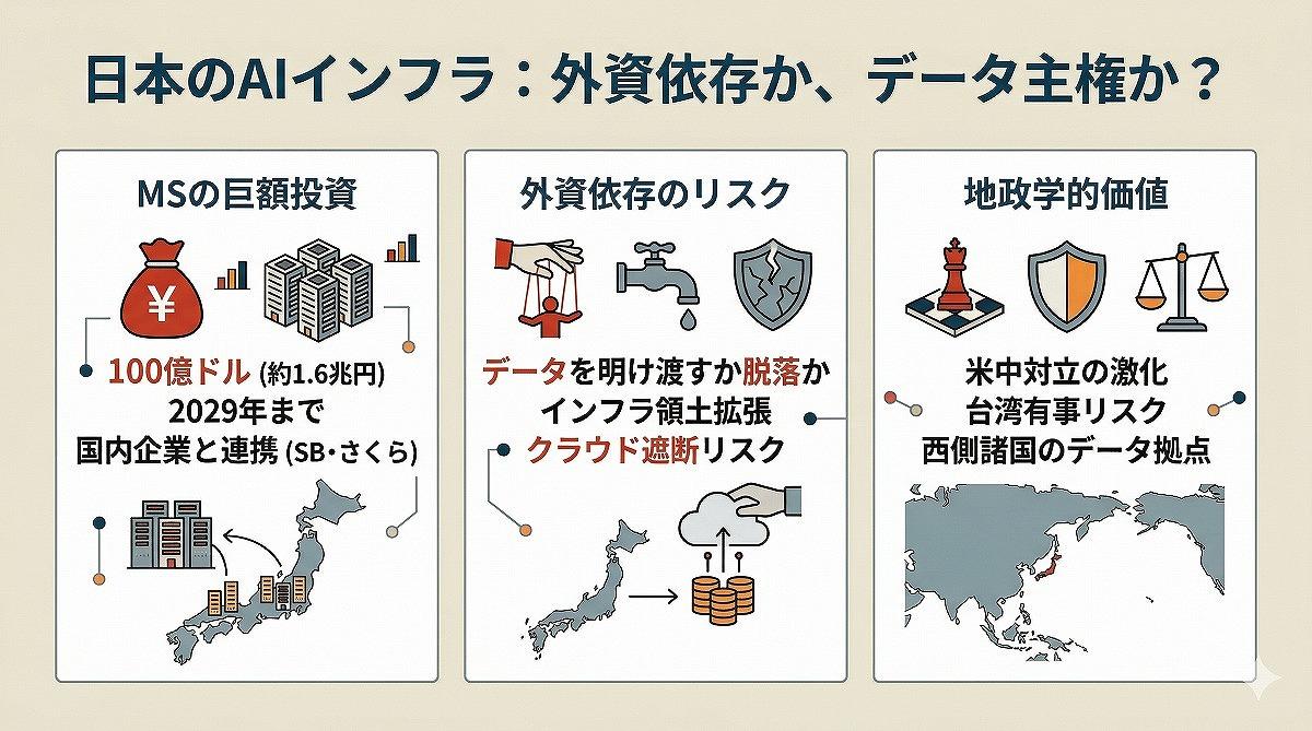 台湾有事のリスクが現実味を帯びる中、中国のデジタル覇権に対抗するためには、西側諸国の強固なデータ連携拠点が不可欠となる。米国政府の意向とも連動する形で、マイクロソフトは同盟国である日本に物理的なインフラを構築し、アジア圏におけるAI支配の要塞を築き上げようとしている。