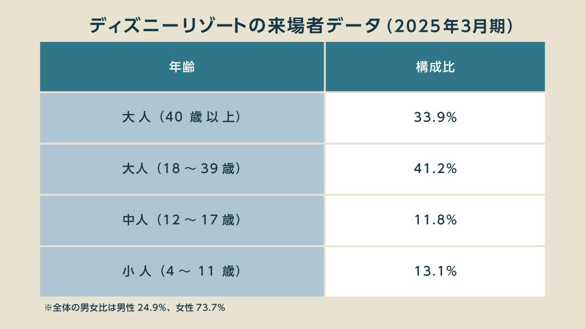 ディズニーのブランド力や好立地が要因といえばそれまでだが、ディズニーは子供への依存度が低く、大人客の取り込みに成功している。来場客は約75%が女性であり、年齢別では70%以上が18歳以上の大人である。つまり「大人の女性」が主要客である。