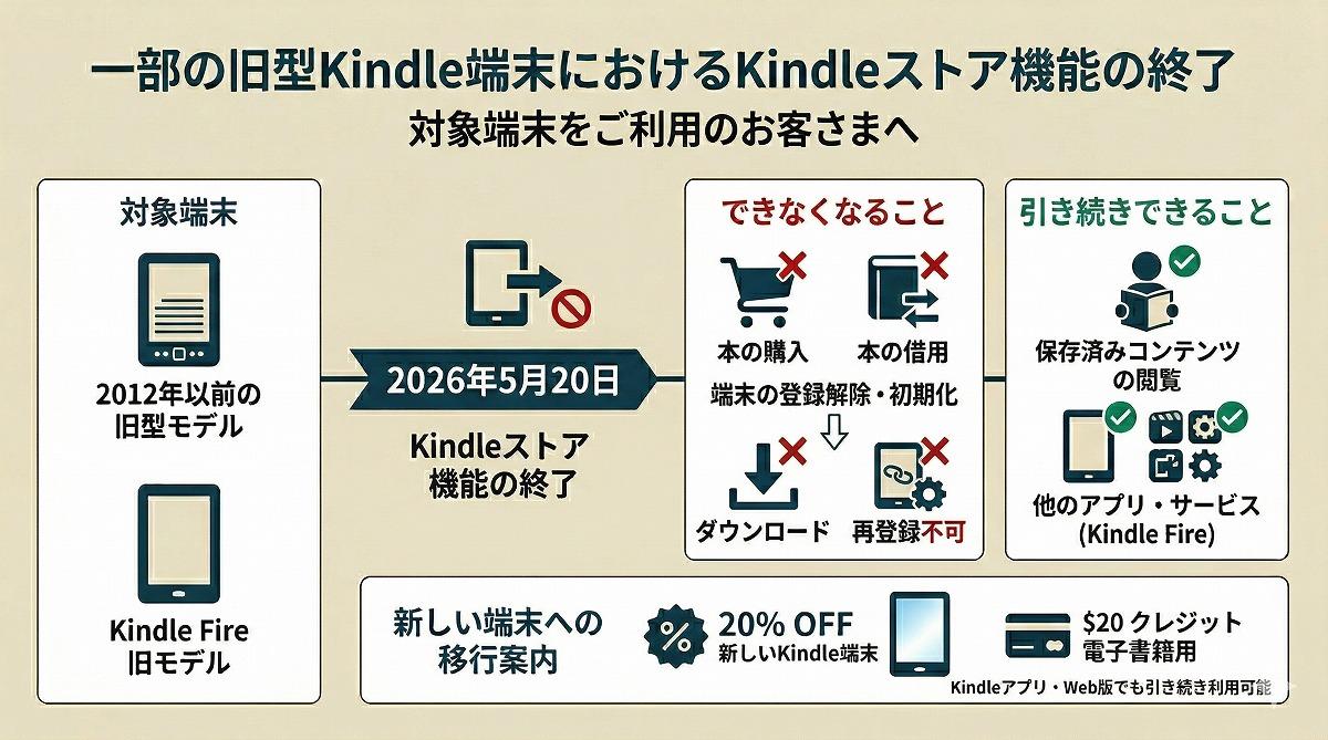利用者は、Kindleアプリ、Kindle for Web、新しいKindle端末から購入済みコンテンツに引き続きアクセスできる。対象機種を使っている利用者には、新しい端末への移行を促す案内も出ており、複数の報道で一致している内容では、新しいKindle端末の購入に使える20%引きと、電子書籍購入に使える20ドル分のクレジットが提示されている。