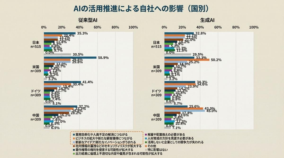さらに注目すべき点は、生成AIの活用による効果・影響だ。従来型AIについては、4カ国とも「業務効率化や人員不足の解消」が最も多い。ところが、生成AIについては、日本と他の3カ国との間に大きな違いが観察される(図表2)。