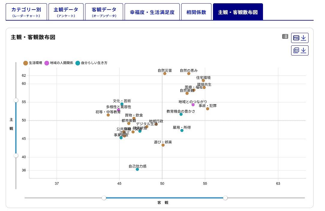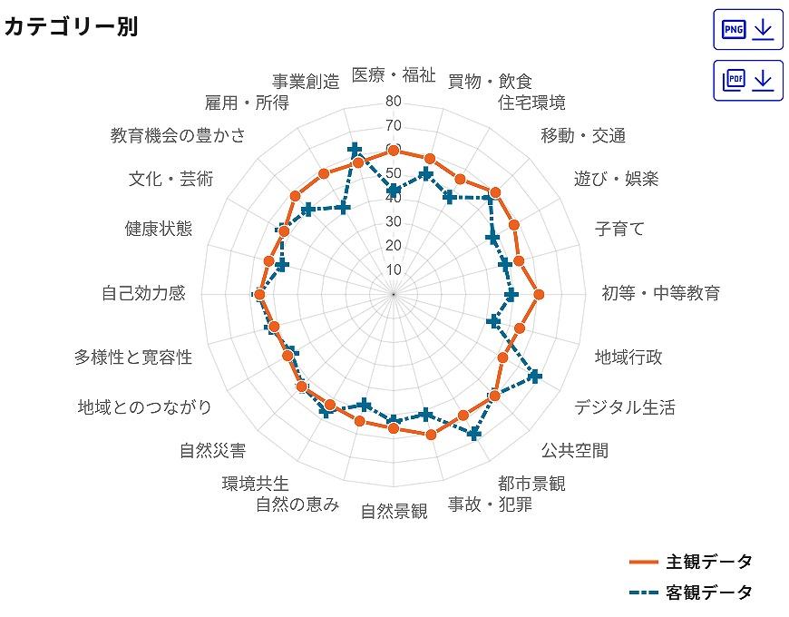 実際のダッシュボード画面(図1)では、まず都道府県や市区町村を選択し、「カテゴリー別」「主観データ」「客観データ」「幸福度・生活満足度」「相関係数」「主観・客観散布図」のタブから、見たいデータにアクセスできます。「カテゴリー別 レーダーチャート」(図2)では、「雇用・所得」や「自然景観」、「初頭・中等教育」「移動・交通」などのカテゴリー別に、主観データと客観データのそれぞれが色分けされ、レーダーチャート形式で表示されます。