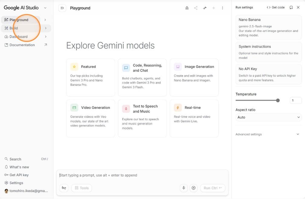 AIを使う方法はいくつかあります。ChatGPTに質問する、Geminiで文章を要約する、ツールを使い比べる。どれも有益ですが、それだけでは「使う人」のままです。次の一手は、AIで作ることです。自分の業務に合ったツールを会話だけで作り、使いながら育てる体験は、消費から創造への大きな一歩です。Google AI StudioのBuild機能は、まさにその「作る体験」への入り口です。Google AI Studioにアクセスしてグーグルアカウントでログインすると、ホーム画面に2つの機能が並びます。さまざまなAIモデルを試す「プレイグラウンド」と、アプリを作る「ビルド」です。今回はビルドを選びます。