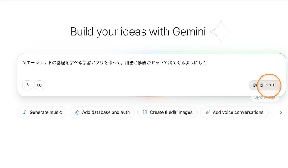 バイブコーディングの第一歩として、自分が毎日使いたい「学習アプリ」を実際に作っていきましょう。ビルドを選ぶと、左側にメニュー、右側にチャット欄が表示されます。チャット欄に作りたいアプリを日本語で入力し、右下のボタンを押します。