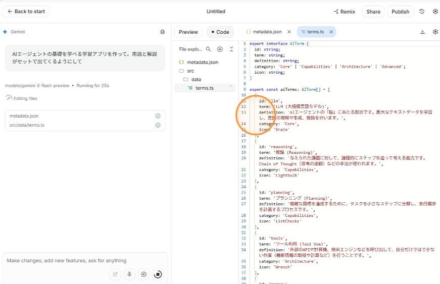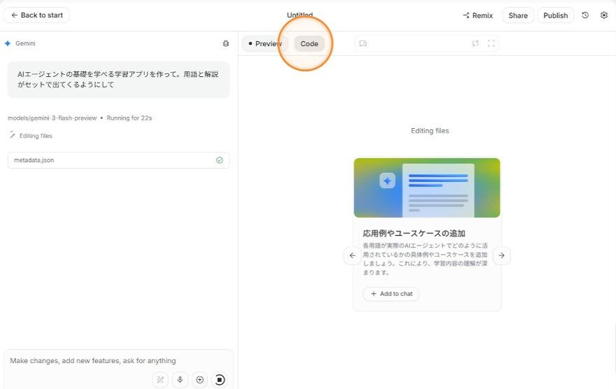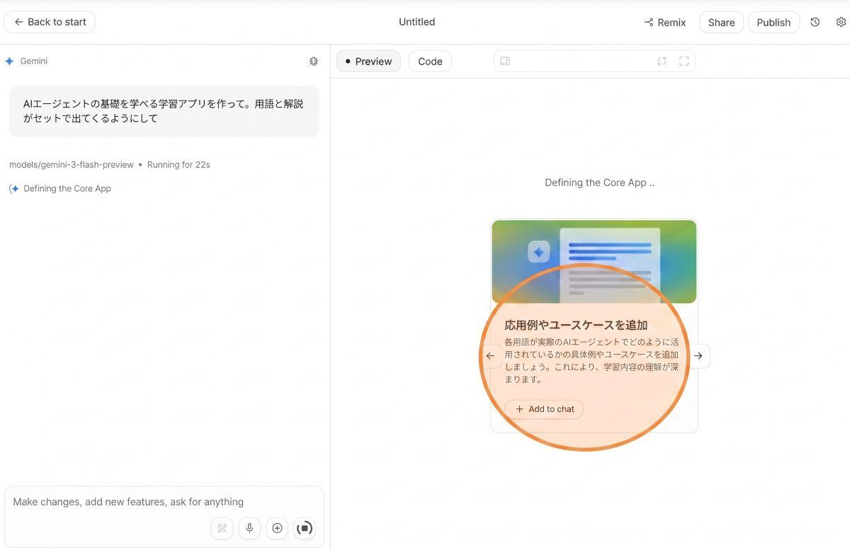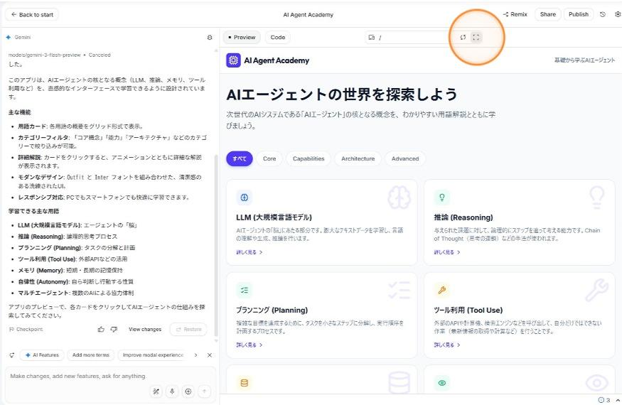 作っている最中は右側にヒントパネルが出て、さまざまなGoogle AI Studioの機能や、今作っているアプリにどんな機能が追加できるかを教えてくれます。