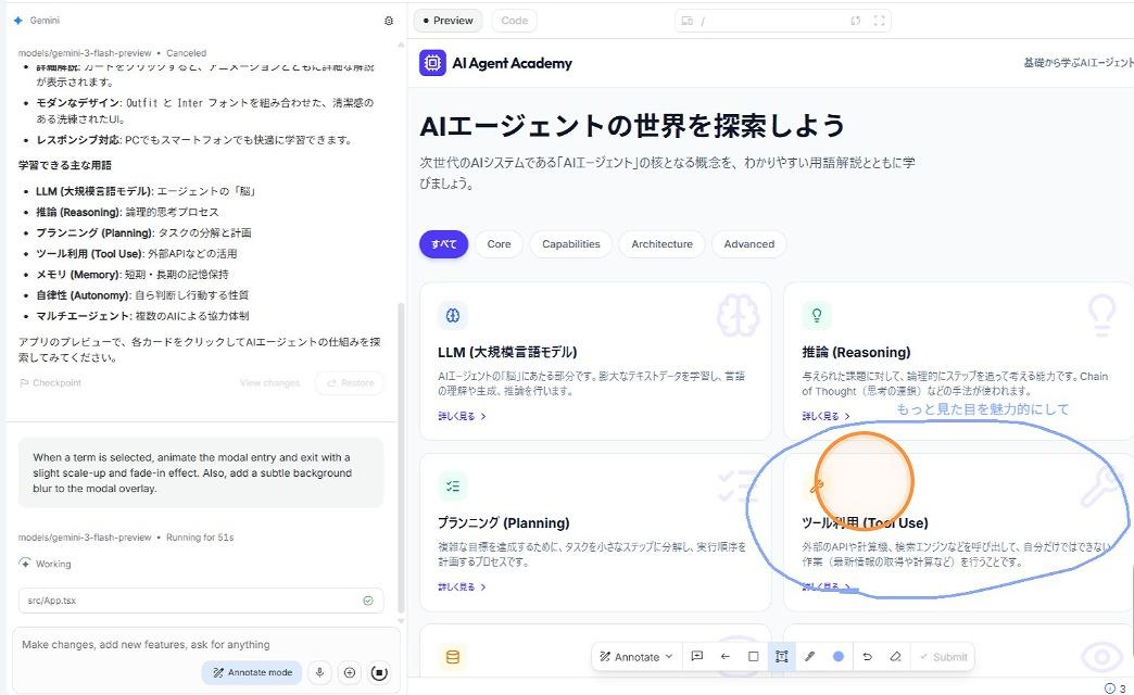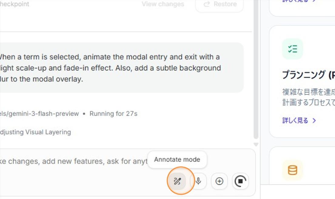 1つが「アノテートモード」です。プレビューのキャプチャにペンで囲んだり手書きのメモを書き込んだりして、画像ごと指示として送信できます。「この辺り全体をかっこよくしたい」という、言葉にしにくいデザイン的な要望を、指差す感覚で伝えられます。