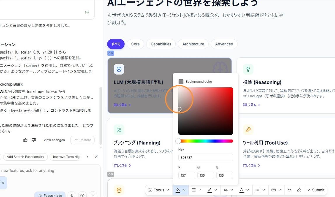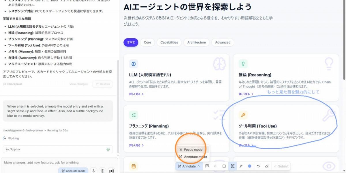 もう1つが「フォーカスモード」です。プレビュー上の要素を直接クリックして選択し、「ここの背景を変えて」「このボタンをもっと大きくして」という指示を場所ごとに正確に出せるようになります。以前は「左上の3番目の要素が……」と言葉で位置を説明する必要があり、AIが誤解してまったく別の箇所を修正してしまうことが少なくありませんでした。フォーカスモードはその手間をほぼゼロにしてくれます。