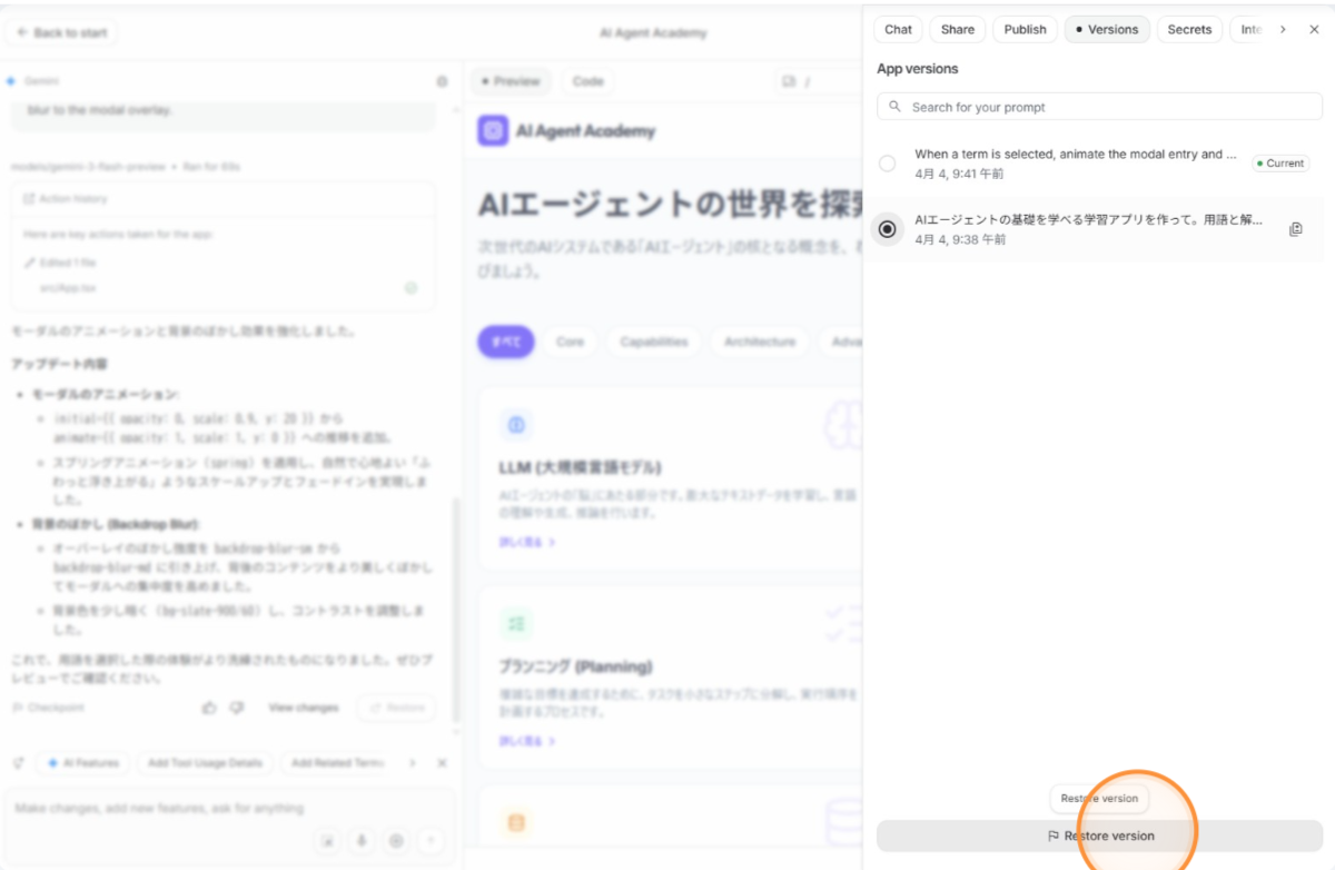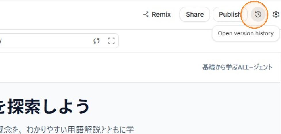 加えて、右上の時計アイコンからバージョン管理機能にもアクセスできます。過去の変更履歴が一覧で並び、いつでも好きな時点に戻せるようになりました。以前は修正を重ねると前の状態に戻れないことがあり、失敗を恐れて試せないという状況が生まれていました。今はバージョンを確認しながら安心して実験できるため、「とりあえず足してみる」という姿勢で開発を進められるようになっています。