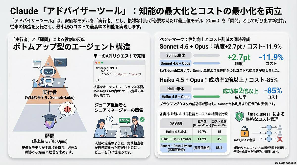 システムは「実行役」と「相談役」の2つの役割で構成される。開発者はベースとなる実行役に、推論速度が速く安価な「Sonnet」または「Haiku」を設定する。実行役はユーザーからの入力受け付け、外部ツールの呼び出し、結果の出力といった処理の大部分を担う。処理の過程で高度な推論や複雑な意思決定が要求される状況に直面した場合に限り、フラッグシップモデルである「Opus」を相談役として呼び出す。