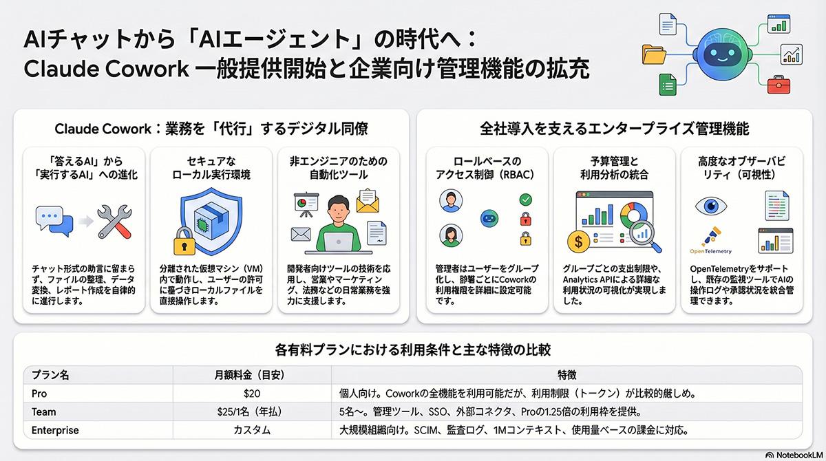 これらの機能追加は、Coworkを早期導入した企業から寄せられたガバナンスやセキュリティに関する運用課題を解決するものである。個人向けの生産性向上ツールとしての枠を超え、企業規模での安全な運用と管理を前提とした業務インフラへの転換を示している。Anthropicは、自律型エージェント機能をすべての有料ユーザーが利用できる環境を展開しつつ、エンタープライズ水準の統制環境を提供することで、法人市場での導入拡大を進める。