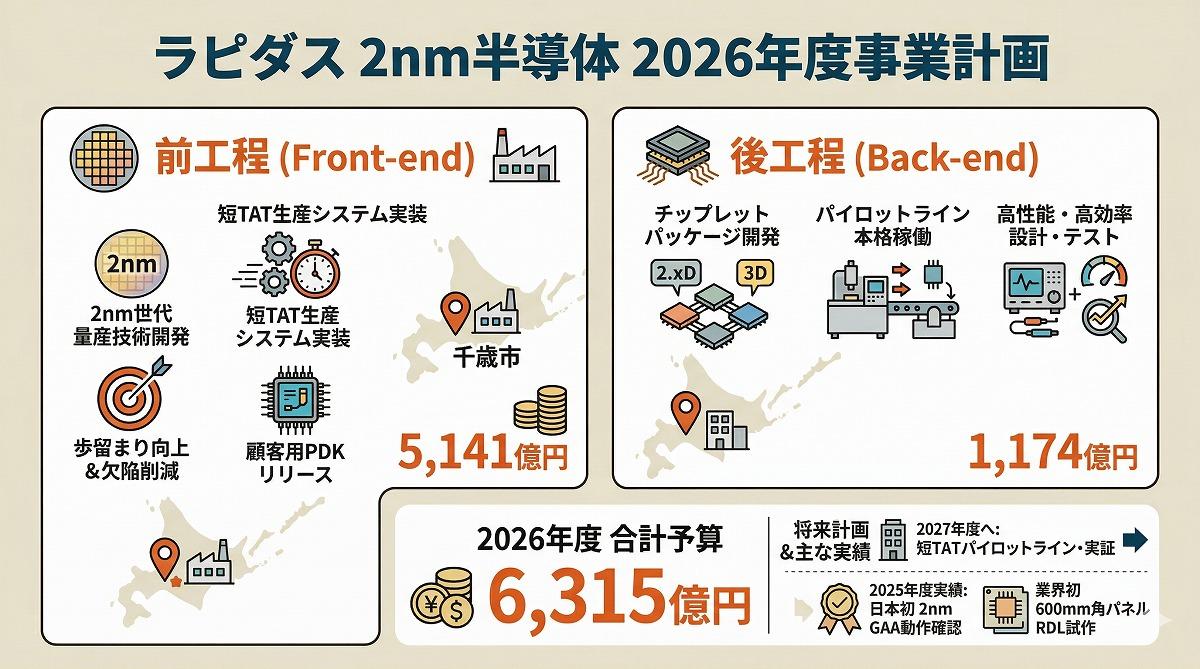 経済産業省の資料では、今回の承認はラピダスの2026年度計画に対する追加支援の決定にあたり、同社は2027年度に2nm世代半導体の短TATパイロットラインを構築し、テストチップによる実証を進める計画だ。ラピダスは今回の承認を受け、量産開始に向けた取り組みを前工程と後工程の両面で進めるとしている。