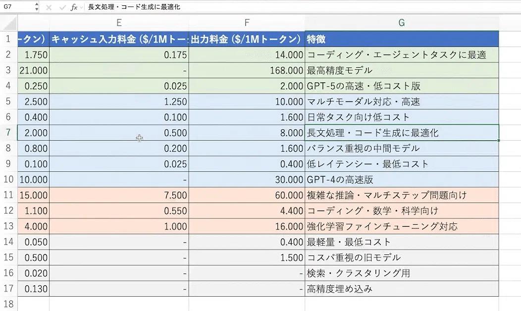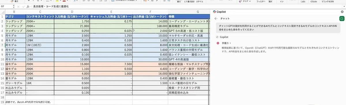 エージェントモードは、強力なインターネット検索機能を備えています。たとえば、「ChatGPTの現行AIモデルの料金比較表を作ってください」と指示するだけで、最新のWeb情報をリアルタイムでリサーチし、モデル名、コンテキスト窓、API単価などを整理した表をシート上に自動生成します。