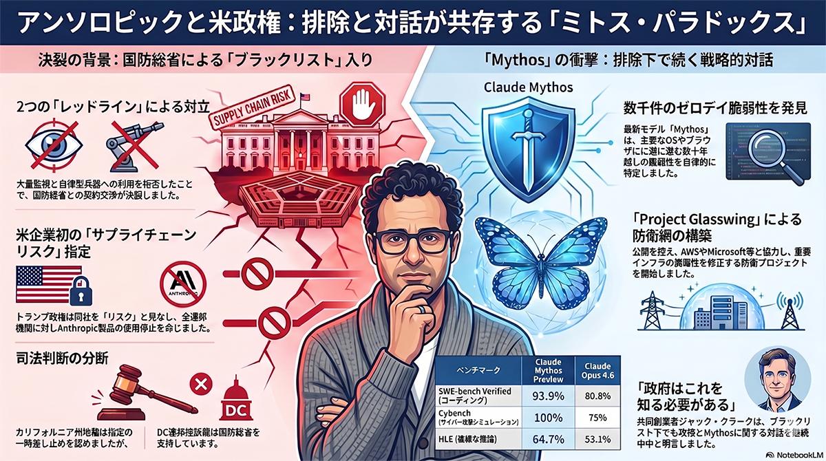 米国防総省は先月、アンソロピックを国家安全保障上の「サプライチェーンのリスク」に指定し、同社製品の利用を事実上禁じた。これに伴い、米財務省、国務省、連邦住宅金融局(FHFA)もアンソロピック製品の利用中止を発表している。この指定に対し、アンソロピック側は不当な措置だとして連邦裁判所に提訴した。しかし、ワシントンの連邦控訴裁判所は4月8日、国防総省の措置に対する事前の差し止め請求を退ける判断を下しており、両者間の法的闘争は継続している。
