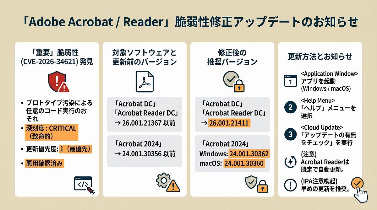 影響を受けるのは、Acrobat DCとAcrobat Reader DCの26.001.21367以前、Acrobat 2024の24.001.30356以前だ。更新後の版は、Acrobat DCとAcrobat Reader DCが26.001.21411、Acrobat 2024はWindows向けが24.001.30362、macOS向けが24.001.30360となる。