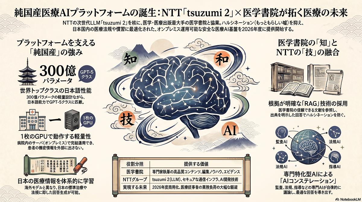 共同開発される医療AI情報プラットフォームは、検索拡張生成技術を用いて医学書院の医療情報を参照しながら回答を生成する仕組みを採用する。この医療情報をNTTの独自の大規模言語モデルである「tsuzumi 2」に学習させることで、公開データのみを学習した一般的な医療特化型LLMとは異なり、日本の医療情報を体系的に学習した純国産のLLMを構築する。インターネット上の不確かな情報に依存することなく、専門家が執筆した出典が明確な情報を提示することで、医療現場においてAIを安心して利用できる環境を提供する。