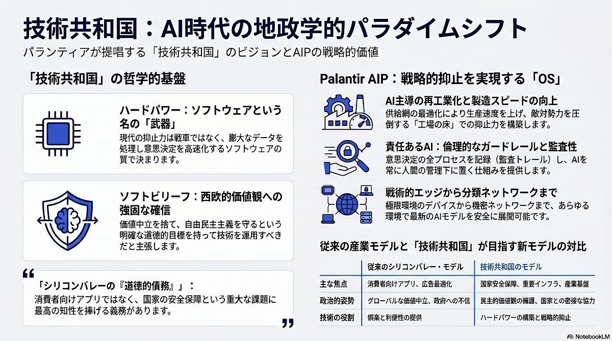 マニフェストの中心的な主張は、AI兵器の開発と技術的ナショナリズムの推進にある。パランティアは、AIの兵器化は不可避であり、西側諸国が倫理的な議論によって開発を躊躇することは国家としての戦略的な脆弱性に直結すると指摘した。同社はシリコンバレーの技術エリートに対し、自らの台頭を可能にした国家に対して「道徳的負債」を負っていると述べた。消費者向けの写真共有アプリなどの開発にとどまらず、国家防衛の取り組みへ積極的に関与する義務があると強調している。具体的な提案の中には、国民の普遍的な義務としての国家奉仕活動を支持する内容も含まれている。