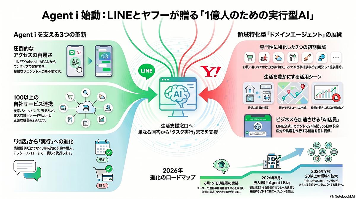 LINEとYahoo! JAPANという国内最大級のメディアとコミュニケーションインフラを統合したこの取り組みは、グローバルなAIサービスに対抗し、日本の生活習慣に最適化されたAI社会の実装を加速させる重要な戦略として位置付けられている。なお、本サービスは13歳以上のユーザーを対象としており、自由入力による対話にはYahoo! JAPAN IDでのログインが必要となる。
