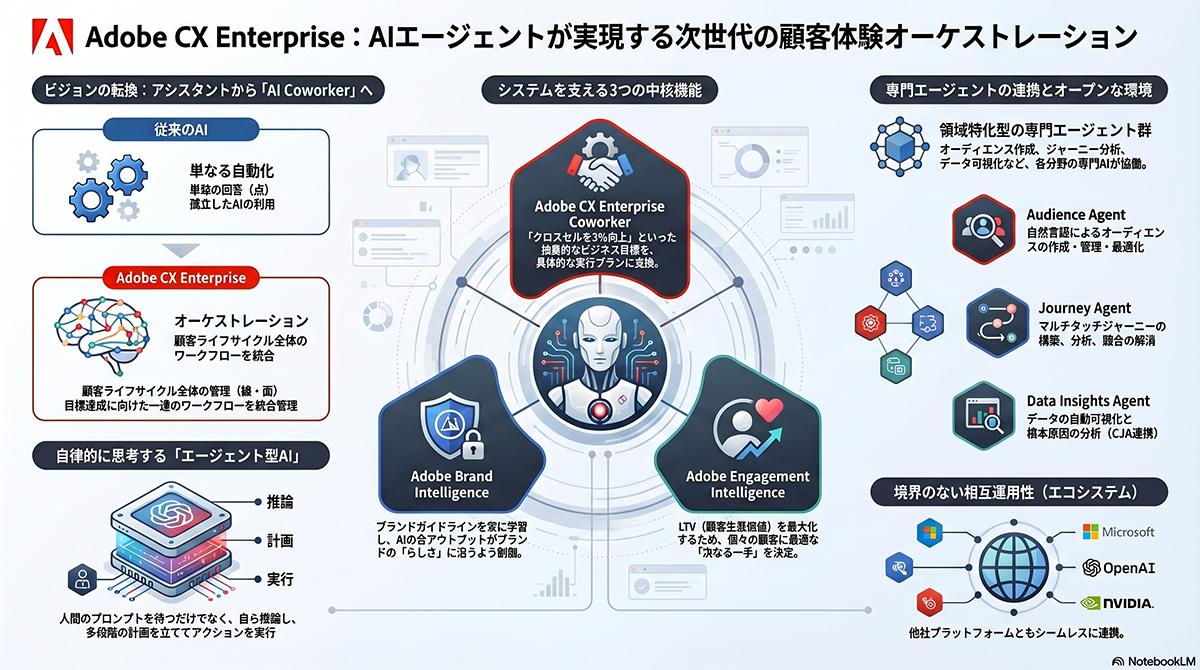 従来のアシスタント型AIが人間の指示を起点に単一のタスクを処理していたのに対し、Adobe CX Enterpriseは定義された目標に基づき、複数ステップのワークフローを自律的に構築して実行する。システム内には特定の業務に特化したAIエージェントが組み込まれ、顧客データの分析からコンテンツの生成、配信までのプロセスを一元化する。
