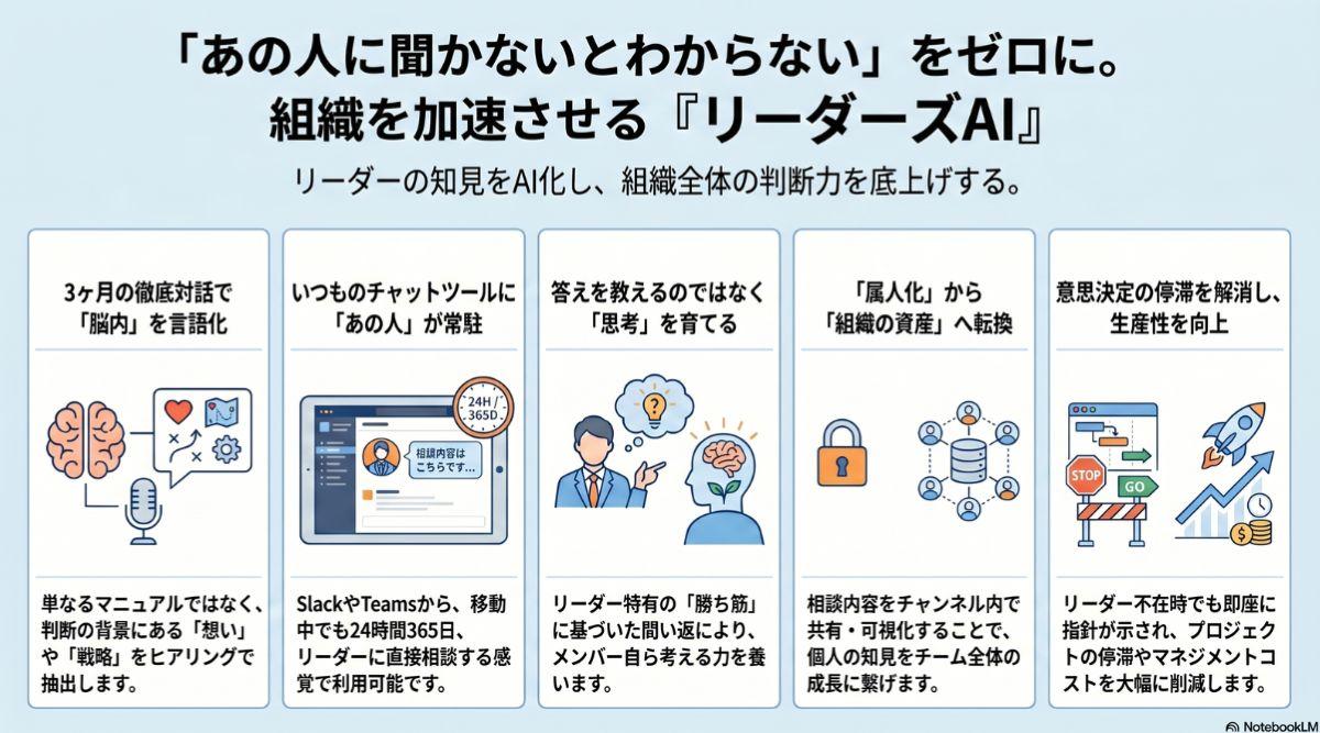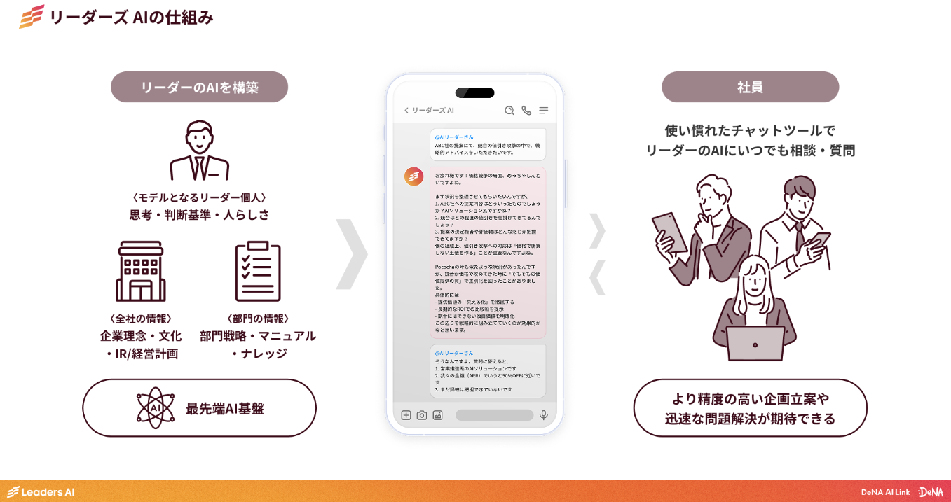 DeNA AI Linkが提供を開始した「リーダーズAI」は、経営者や事業責任者、熟練の担当者など、組織内で判断や意思決定の拠り所となっている人物の思考プロセスや経験をAI化するサービスである。汎用的な生成AIでは自社の文脈に沿った回答が得られないという課題に対応する。「あの人に聞かないとわからない」という属人的な情報偏在を解消し、個人に閉じていた知見を組織全体の共有資産に変換する。同サービスは、利用者に対して一方的に正解を提示するのではなく、問い返しや深掘りといった対話を通じて、利用者自身の思考力を育成する設計となっている。