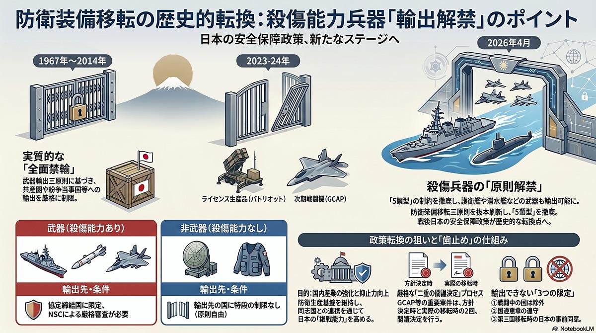 武力紛争の一環として現に戦闘が行われている国への輸出は引き続き認めず、移転先は国連憲章の目的と原則に適合した使用を義務付ける国際約束の締結国に限定する。個別案件ごとに審査を行い、国家安全保障会議での審議と情報公開を行う手続きを定めている。一方で、今回の決定に対する懸念や反発も顕在化している。野党側は、国会の事前関与がなく行政の裁量で決定されるプロセスの不透明性を指摘し、「死の商人」になる危険性を主張する。