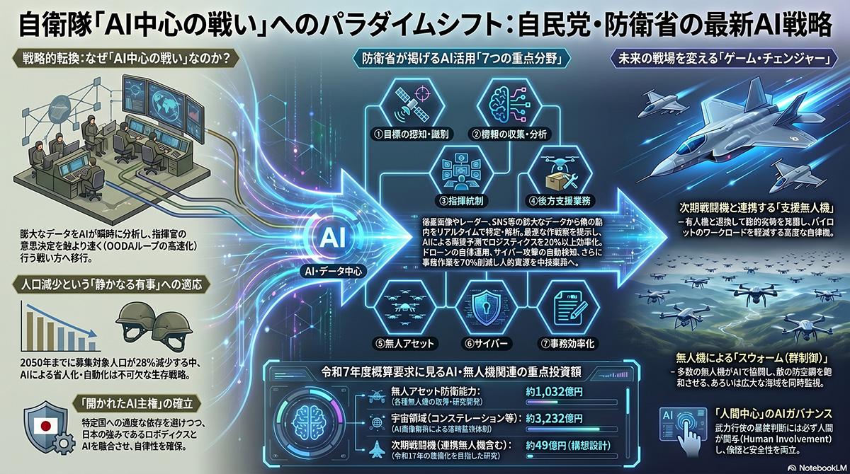 特に、米イスラエルの対イラン軍事作戦において情報分析や標的選定にAIが本格的に投入された状況などを念頭に置いている。今後の方向性として、防衛力整備や自衛隊のドクトリン、平時の訓練においてもAI活用を進め、AIを統合作戦基盤として活用する段階への移行を求めている。防衛省が策定した方針では、目標の探知・識別、情報収集・分析、指揮統制、後方支援、無人アセットの群制御、サイバーセキュリティ、事務処理の7分野がAIの重点活用領域とされている。