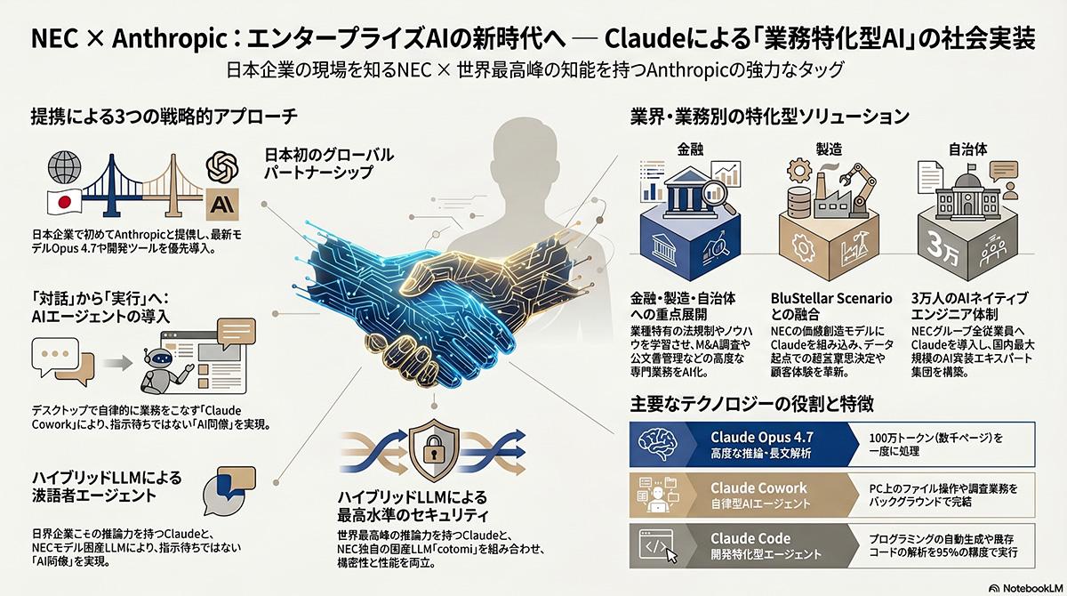 NECが長年培ってきた公共・産業分野のドメイン知識と、アンソロピックの持つ高度な安全性と推論能力を融合させることで、日本企業の生産性向上と競争力強化を直接的に支援する体制を敷く。両社は信頼性の高いAIガバナンスを確立しながら、技術を現実のビジネス環境へ適合させるための長期的な協力関係を維持していく。