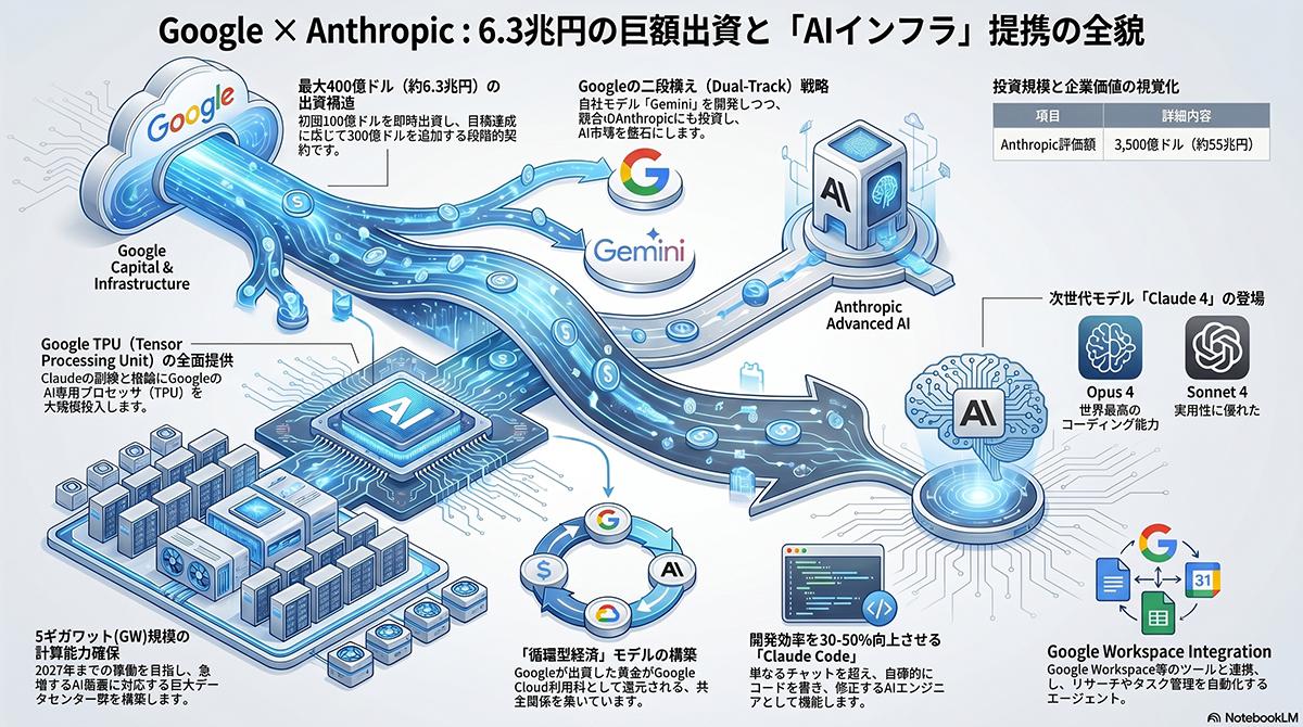 Anthropicを取り巻くテック大手企業の投資競争は激化の一途をたどっている。今回のGoogleの出資判明の数日前には、米AmazonがAnthropicに対して最大250億ドルを出資する計画を発表した。Anthropicは2026年2月にも300億ドルの資金調達を実施しており、当時の企業評価額は3800億ドルに達していた。Googleは自社でも生成AIモデル「Gemini」を展開しており、競合関係にある有力企業に対して巨額の投資とインフラ提供を並行して行うことで、拡大するAI市場における自社の影響力を確保する。