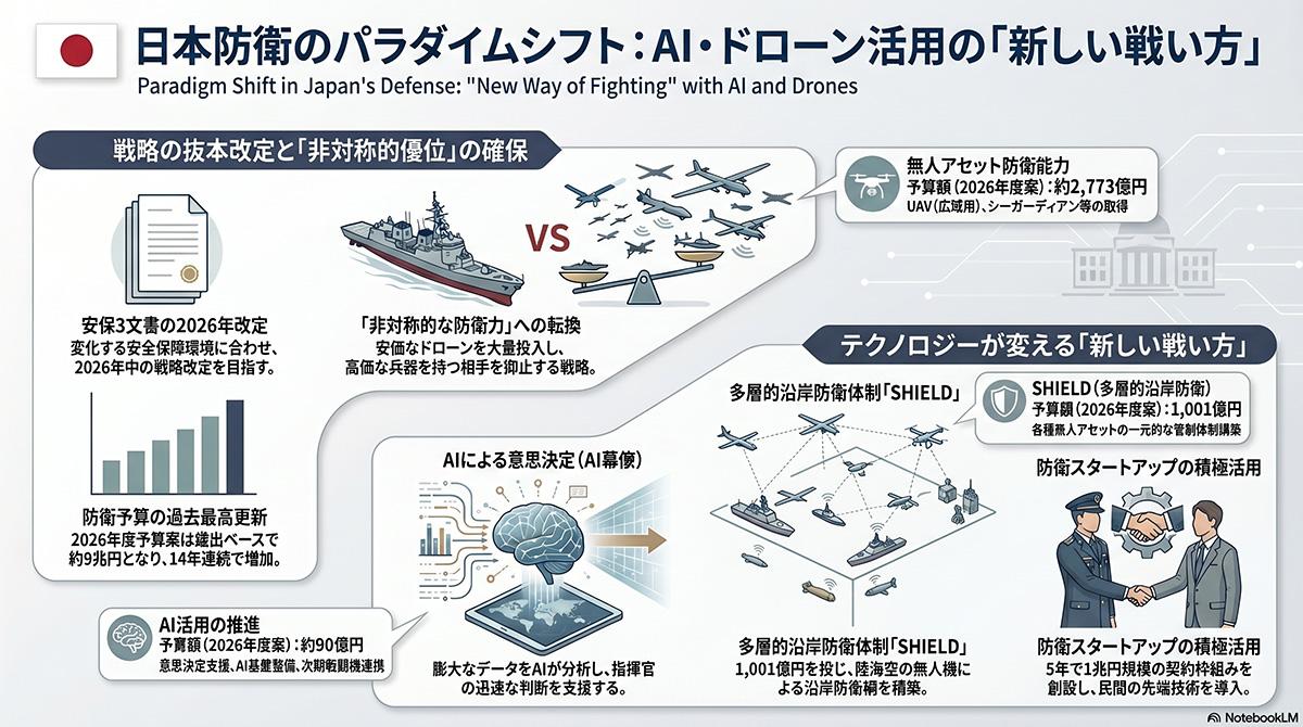 ウクライナ侵攻や中東での紛争において、大量のドローンとAIによる自動制御システムが戦場を一変させた事実を踏まえ、政府は「非対称的な防衛力」の構築を急ぐ。これに先立ち、自民党安全保障調査会は同年4月22日に論点整理に着手し、量で勝る相手からの侵攻に対処するため、安価に大量生産できる無人機や敵の射程外から攻撃するスタンド・オフ防衛能力の中核化を求める提言案を示した。同時に、長期間にわたり防衛体制を維持するための継戦能力確保も重要課題となる。
