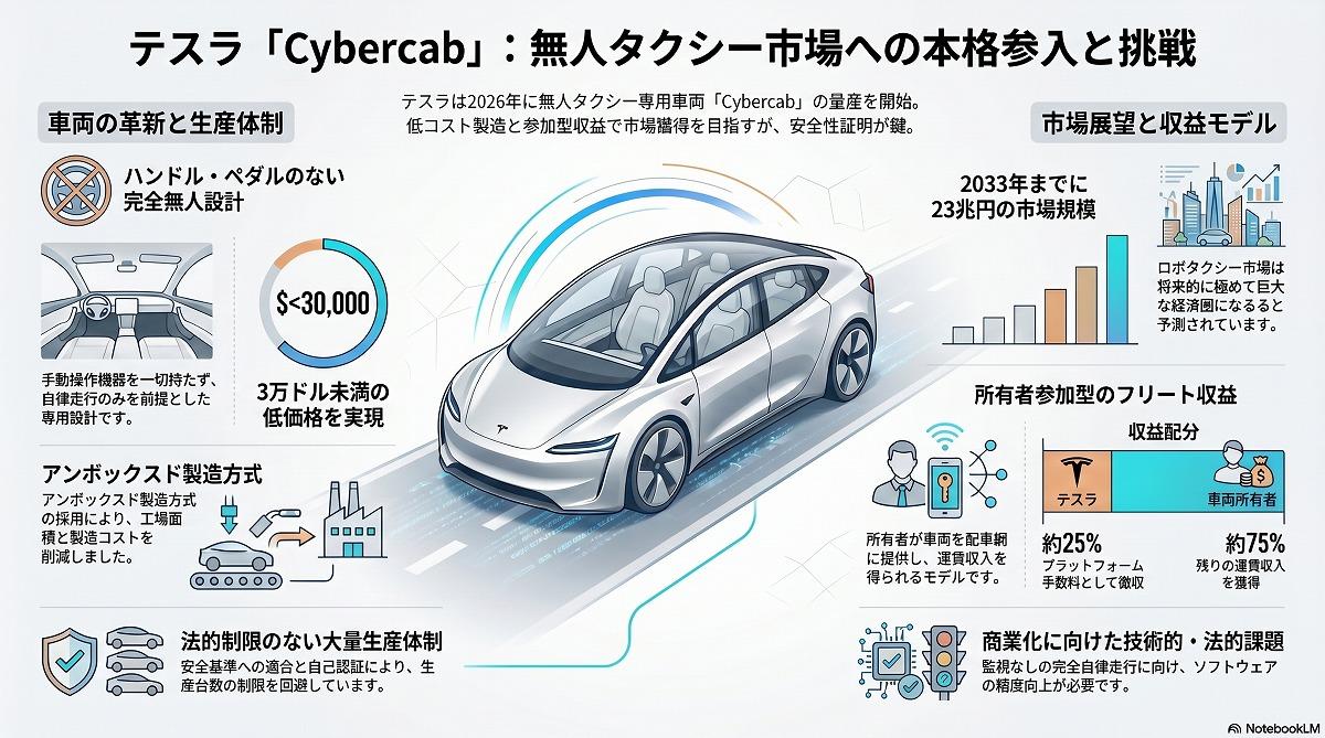 米テスラ、無人タクシー「Cybercab」の量産を開始─自律走行車市場への参入体制を構築