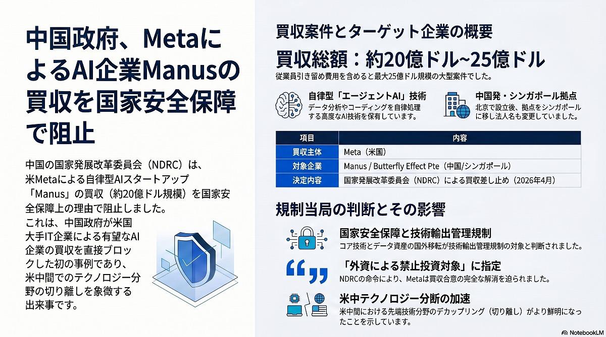 マナス側は米中間の技術覇権争いや地政学的リスクを回避するため、事前に本拠地を中国本土からシンガポールへ移し、法人名を「Butterfly Effect Pte」に変更して事業を展開していた。これに対し中国当局は数カ月に及ぶ外資投資の安全保障審査を実施した。調査の結果、マナスのコアチームや独自技術、データ資産が中国国外へ移転した経緯が中国の技術輸出管理規制の適用対象となり、今回の取引は外資による禁止投資対象に指定された。NDRCが発出した買収阻止の命令を受け、メタは直ちに進行中の手続きを巻き戻し、買収の合意を完全に解消する措置を取る。メタ側は本件の進行において、現地の適用法を完全に遵守していたとする公式声明を発表した。