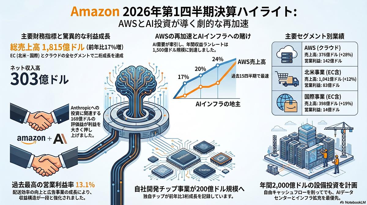 Amazonの2026年第1四半期決算、AWS売上高が28%増、Anthropic評価益で純利益は大幅増
