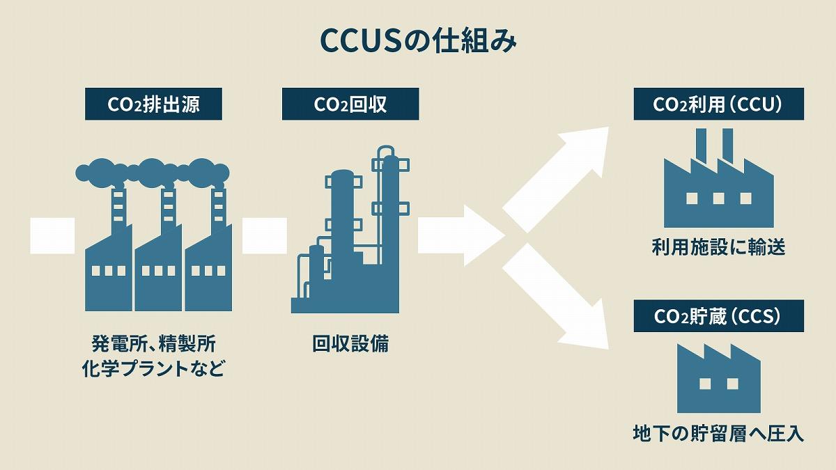 CCUS(Carbon dioxide Capture, Utilization or Storage)とは、CO2を分離回収し、有効利用または地中に貯留する技術の総称