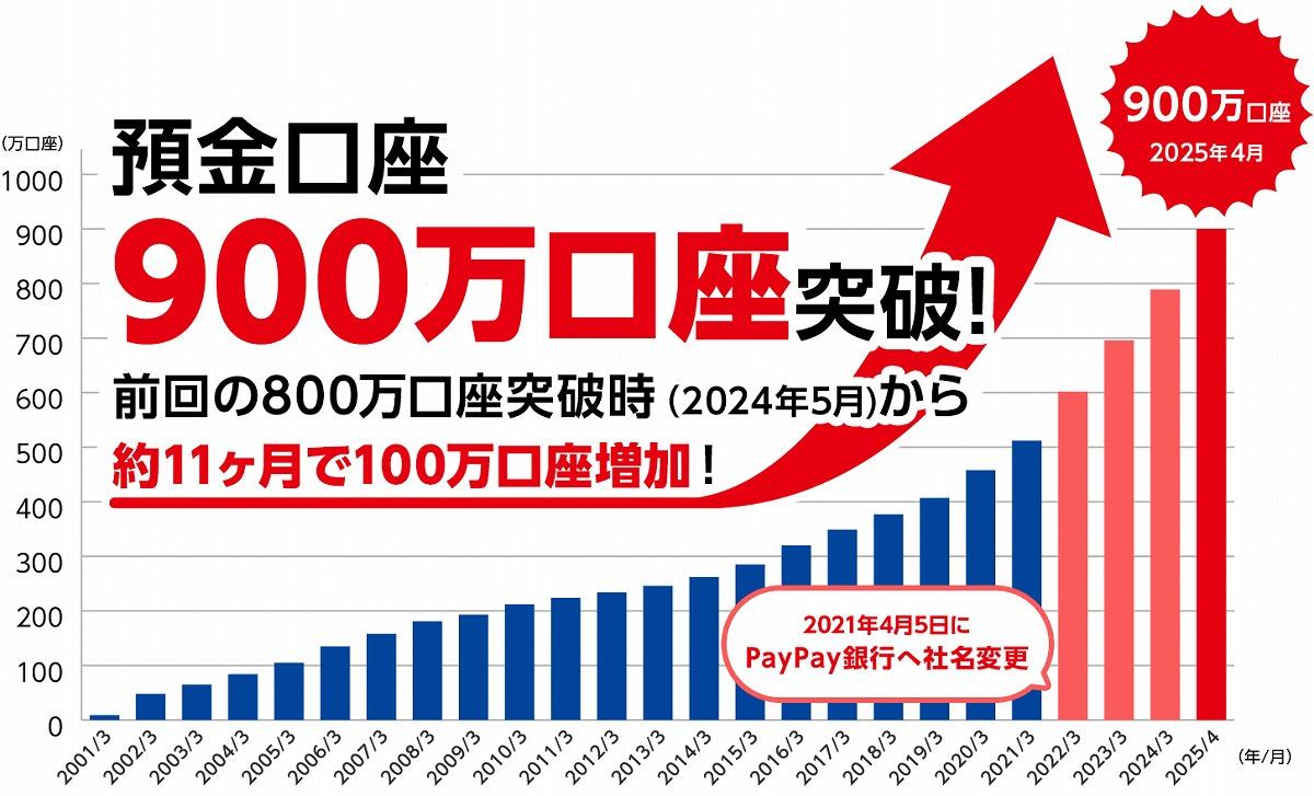 PayPay銀行は、もともと2000年に日本初のインターネット専業銀行として開業したジャパンネット銀行が母体だ。2021年4月にPayPay銀行へと商号を変更し、2024年5月には800万口座、2025年4月には900万口座を突破。商号変更から4年で400万口座を積み増したことになり、「PayPay」の名前を冠した商号変更は成功だったと言えるだろう。ネット銀行の業界では、2025年5月末で1700万口座を突破した楽天銀行が突出しており、住信SBIネット銀行が846万口座(2025年6月末)、auじぶん銀行が2024年4月で600万口座となっており、900万口座突破はネット専業銀行では上位に位置する。