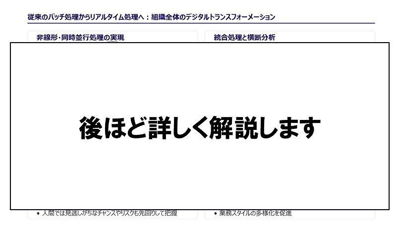 具体的には、部門間で分断されがちなデータを統合し、リアルタイムかつ非線形に処理することで、驚くほど短時間で与信判断や不正検知が可能になるでしょう。対面手続きを減らしながら、きめ細かい顧客対応が可能になり、コスト削減だけでなく顧客満足度の向上にもつながります。