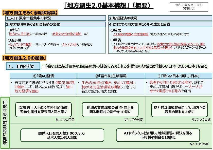 これを受け今般、6月に公表された「地方創生2.0」においては、地域の人口減少を避け難いものと受け止めた上で、地域自らが将来予見される最低限の人口リソースをもって地域インフラの維持や社会基盤のマネージメントを実現することを掲げた。