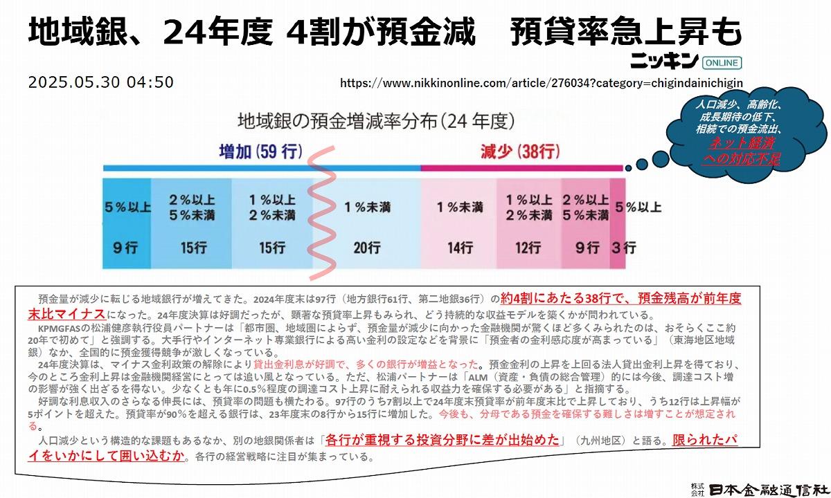 2025年5月30日付のニッキン(日本金融通信社)本紙は、24年度に地方銀行と第二地方銀行合わせて約100行のうち、4割の銀行で預金残高が前年度比で減少していたと報じた。具体的には、2024年度の地銀預金増減率の内訳として、「前年割れ(-1%以上)」が24行、「ほぼ横ばい(±1%以内)」が34行、「1~5%増」が30行、「5%以上増」が9行という状況とのことだ。