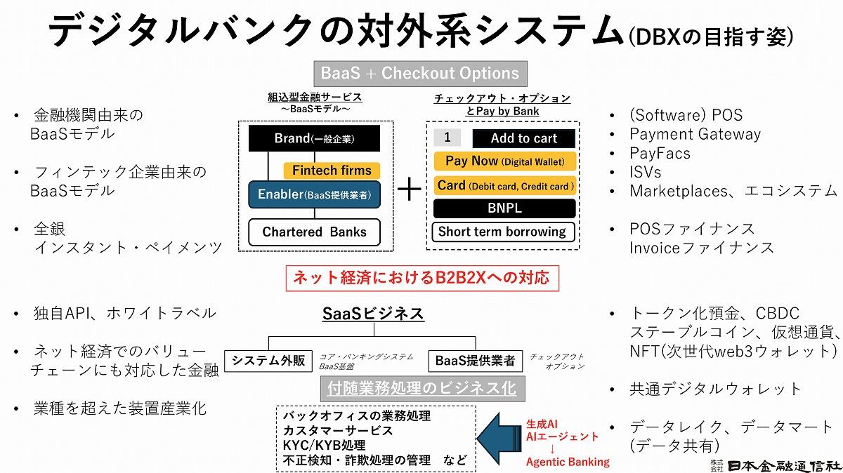 APIでBaaS基盤上に接続し、さらにチェックアウトの選択肢を銀行自身が提供できるか、AIによるハイパーパーソナライズな選択の提案をできるか、越境EC決済での外為処理に加えてweb3対応もできるかどうかが、対外系再定義の核心になってきている。